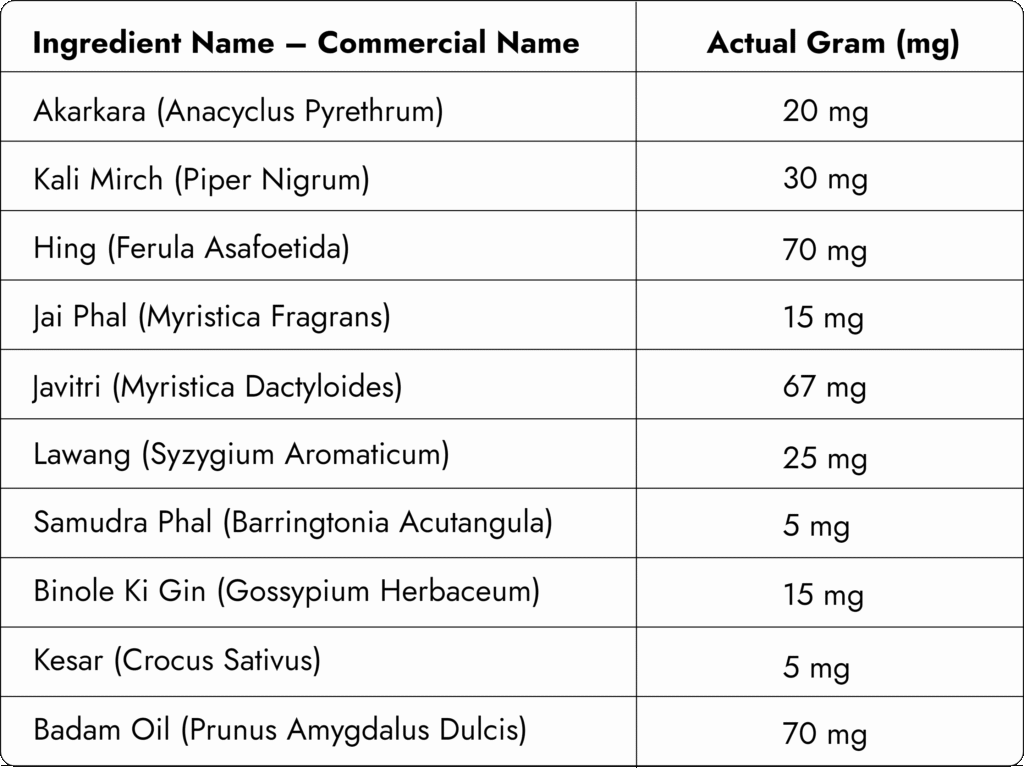 - स्तंभन दोष (Erectile Dysfunction) में प्रभावी राहत – काली मिर्च, लौंग, हिंग और अकरकरा का शक्तिशाली मिश्रण नसों को अंदर से मजबूत बनाता है और इरेक्शन की कमजोरी को प्राकृतिक रूप से ठीक करने में सहायक है।